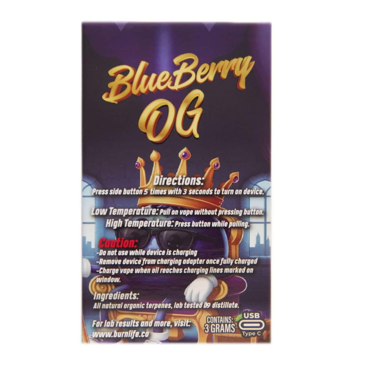 The Burn disposable vape Blueberry OG pen contains 3000mg of blueberry flavoured THC distillate. The distillate is derived from organic Blueberry OG flower, which is hybrid strain – 50% indica/50% sativa. No solvents are used in production to derive the THC distillate – making the whole process as natural as possible. On top of that, this pen is also rechargeable and therefore will never run out of battery before it’s fully consumed!