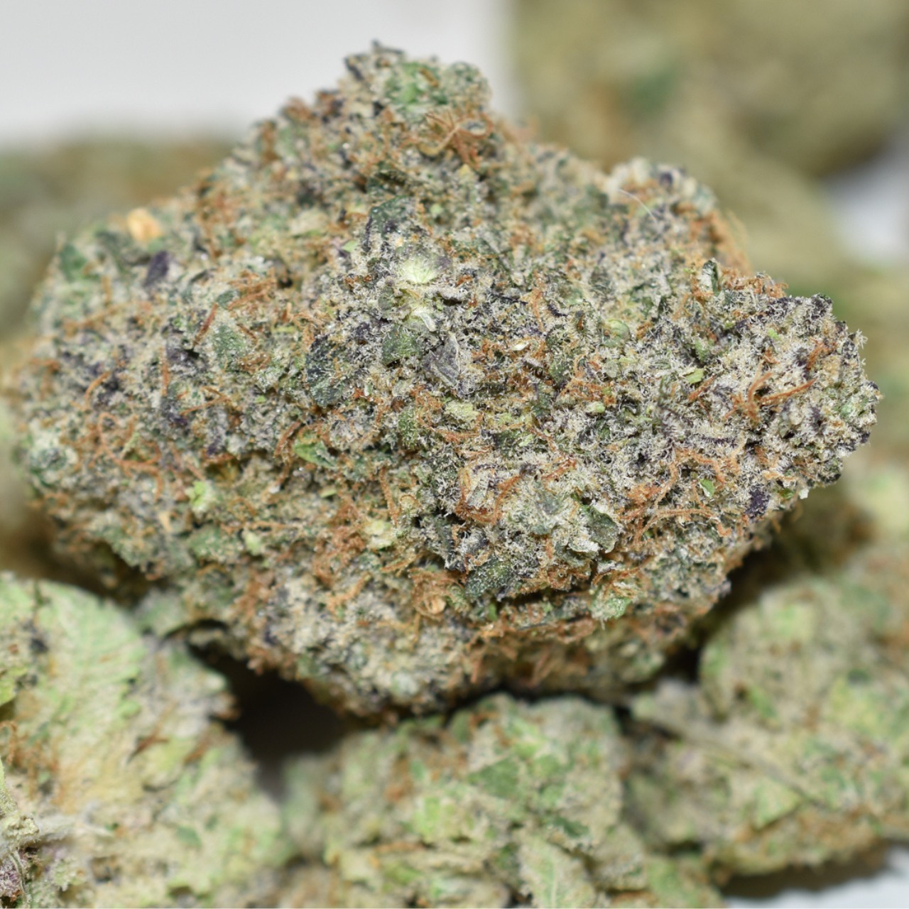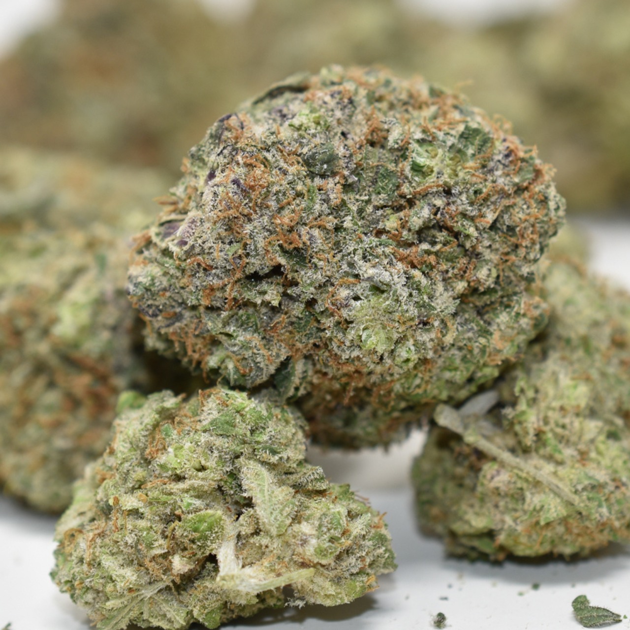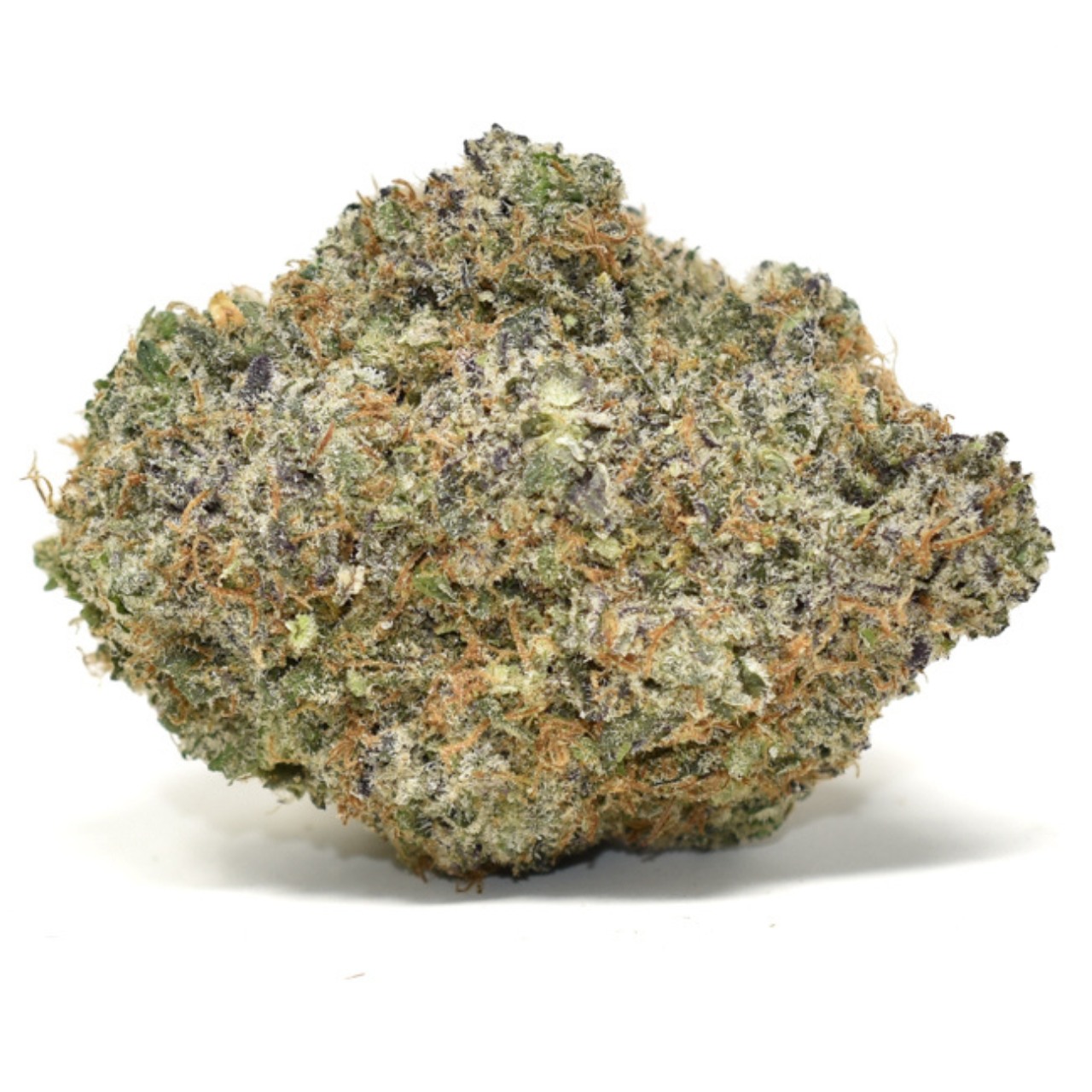 This strain features fluffy, tapered forest-green buds accented by sparse orange hairs and a frosty coating of clear crystal trichomes.