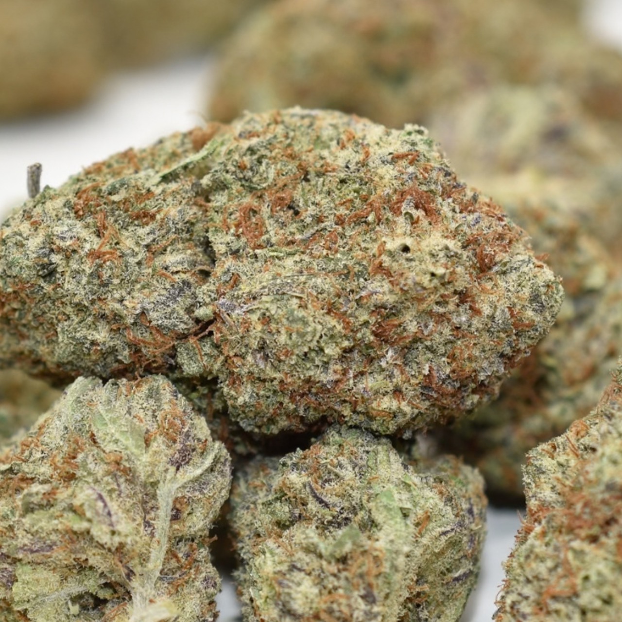 The buds are dense, heart-shaped, and forest green, adorned with vibrant orange hairs and a thick coating of frosty, milky amber trichomes. These crystal-coated nugs make it as visually appealing as it is flavourful.