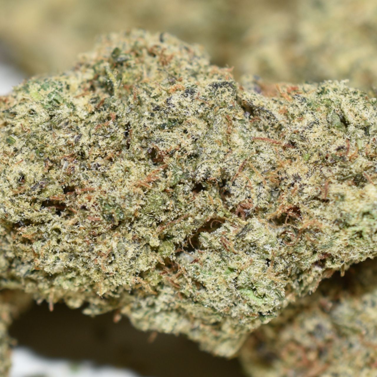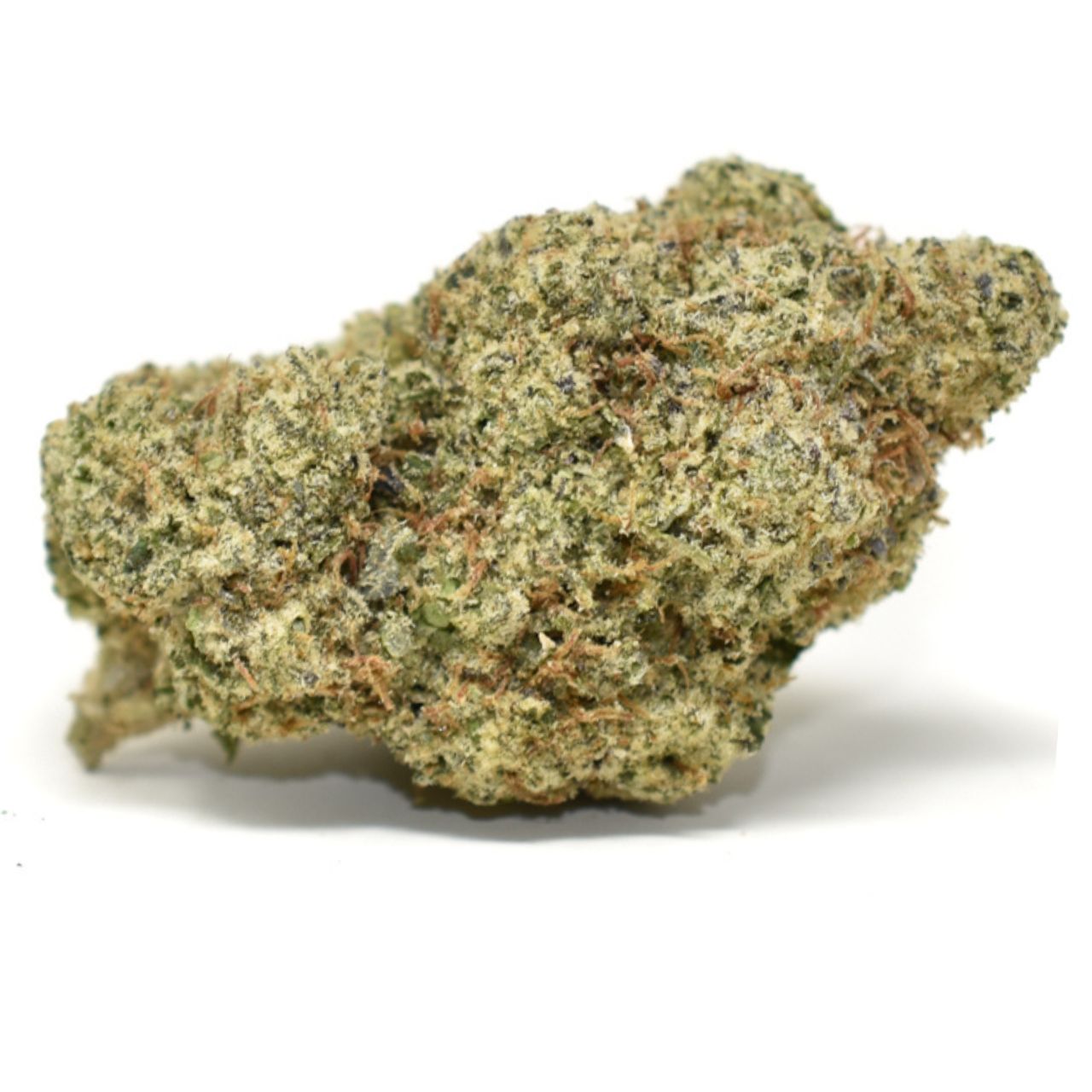Runtz buds are as vibrant as its effects, featuring dense, grape-shaped olive green nugs adorned with thin orange hairs, dark purple undertones, and a layer of frosty, purple-tinted trichomes that shimmer in the light.